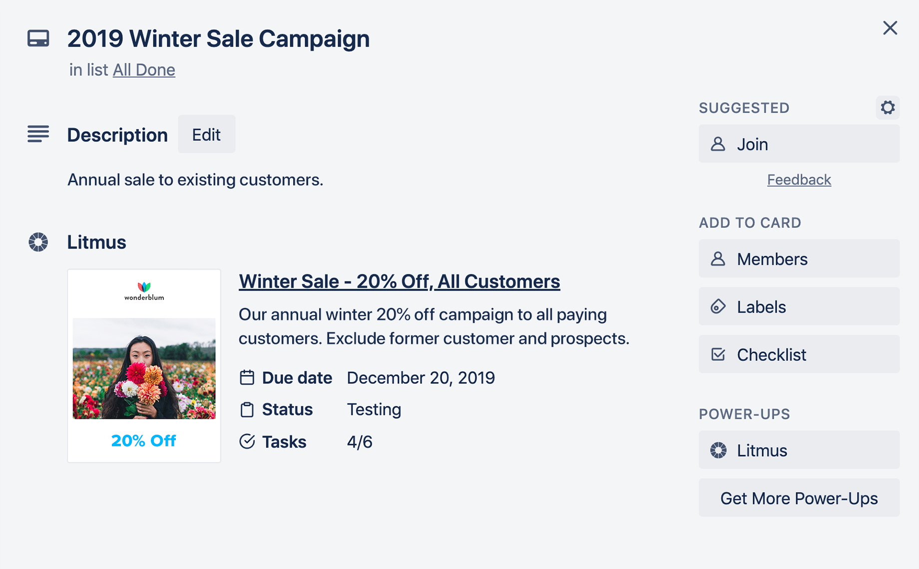 The Litmus Power-up option on a Trello card gives users the option to select from the most recent emails in their Litmus account or search all of their emails. They can then attach one or more emails to the “back” of a Trello card (the expanded details view). This will add the email’s title, description, due date, status, and number of tasks to a special section on the card. It also displays a thumbnail image of the email.